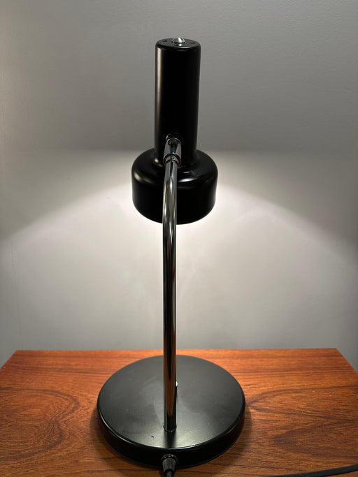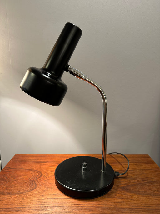 Hübsche kleine, schwarze Tischleuchte aus den 70er Jahren. Beweglicher Hals. Metallfuss schwarz. Höhe: 44 cm / Breite: 24 cm